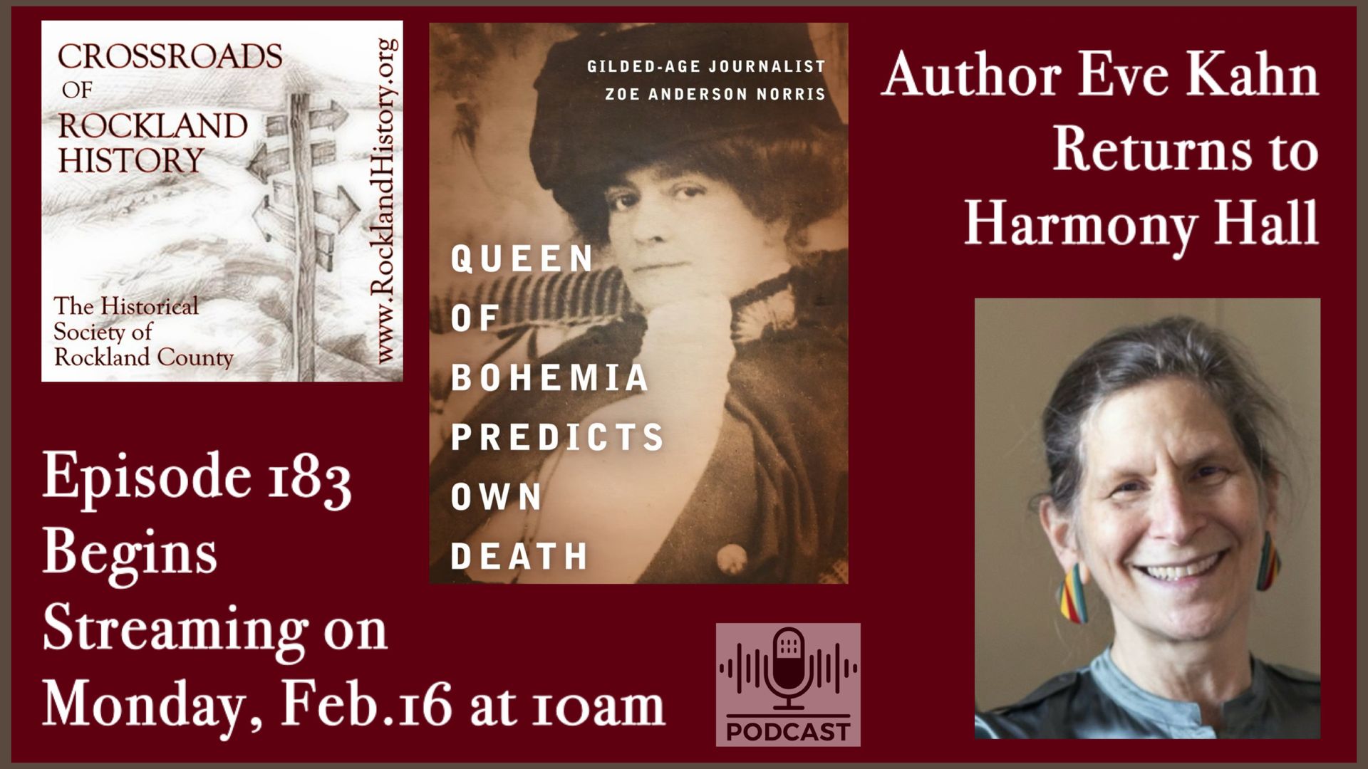 Author Eve Kahn returns to discuss her latest work ahead of her March presentation at Harmony Hall. The focus will be on her new book, Queen of Bohemia Predicts Own Death: Gilded Age Journalist Zoe Anderson Norris