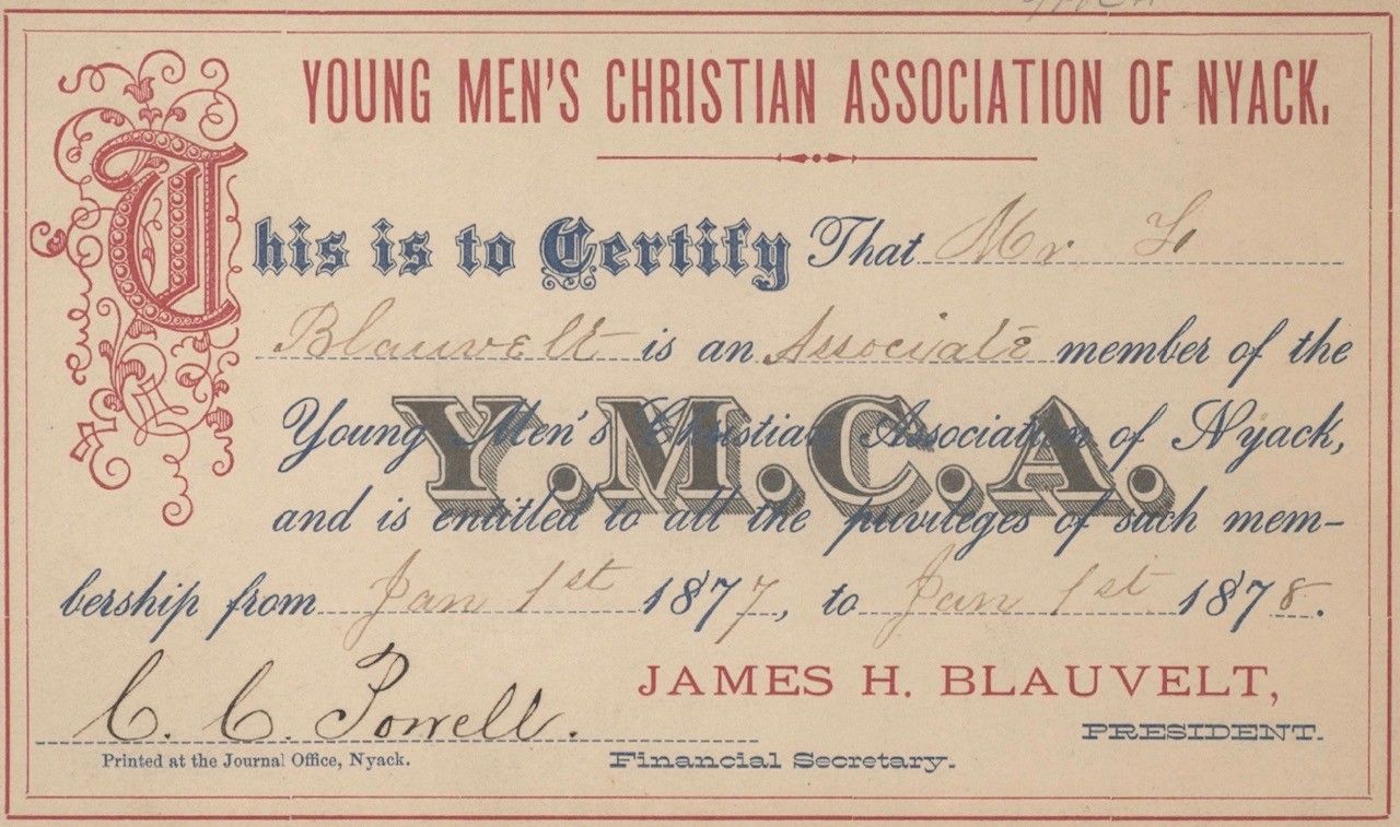 [Image: YMCA Membership Card, 1877. Image courtesy of the Nyack Library, via NYHeritage.org.]